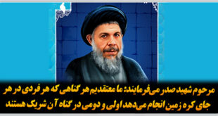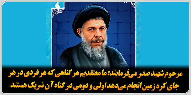 مرحوم شهید محمدباقر صدر میفرمایند: ما معتقدیم هر گناهی که هر فردی در هر جای کره زمین انجام میدهد اولی و دومی در گناه ان شریک هستند.